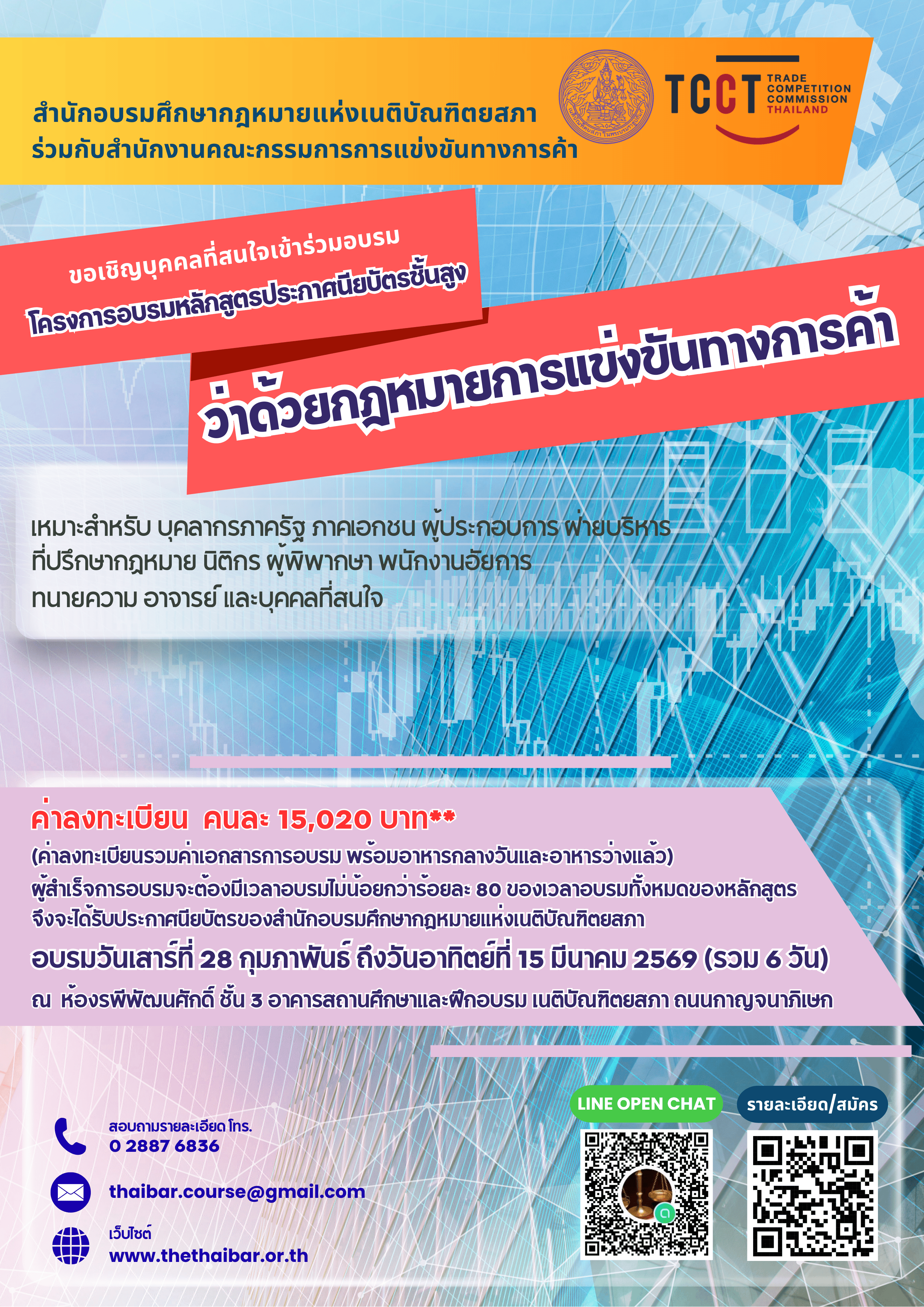 โครงการอบรมหลักสูตรประกาศนียบัตรชั้นสูงว่าด้วยกฎหมายการแข่งขันทางการค้า📅 รับสมัคร: 20 ธ.ค. 2568 - 21 ก.พ. 2569 คลิกดูรายละเอียดและสมัคร |